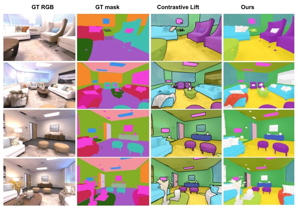 We introduce GS3DS, a method takes a set of multi-view RGB images as input, and passes these images through a pre-trained instance/semantic segmentation method. Although accurate, segmentation methods for 2D images do not generate multi-view consistent segmentation masks. Observe how labels vary across the images. Our method formulates this as a clustering problem in 3D, utilizing feature-vectors in 3D space which are trained using contrastive losses. Our method generates consistent segmentation masks.
